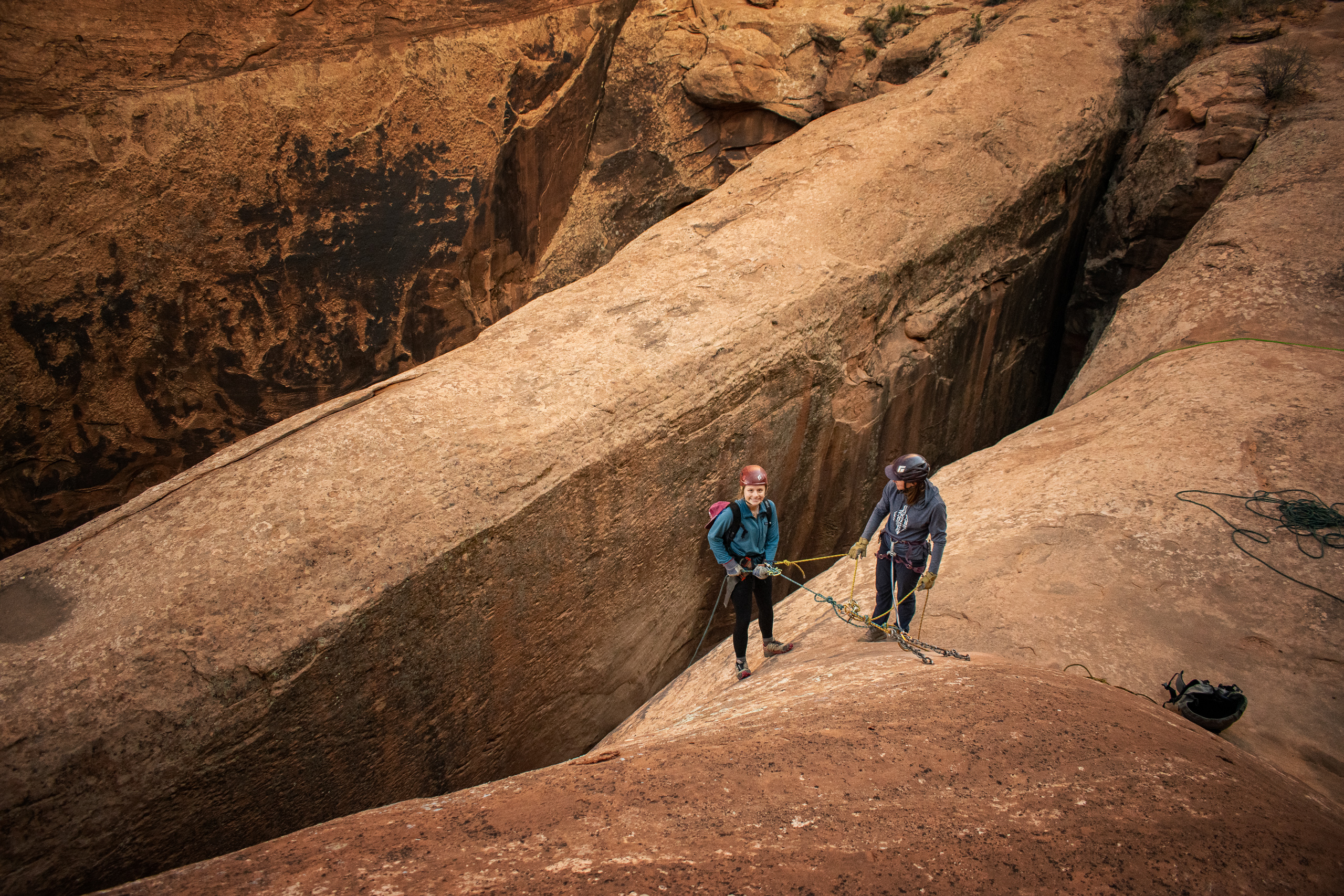 Now, totally enveloped in a small stone room, whose floor rarely sees the light of day, we exit to find our next challenge: a jaw-dropping rappel into the alluring green canyon below next to an enormous natural stone bridge — the 6th largest natural land bridge in the world! A cool spring-fed stream accompanies us for the rest of this outstanding hike, exiting into the Colorado river corridor.